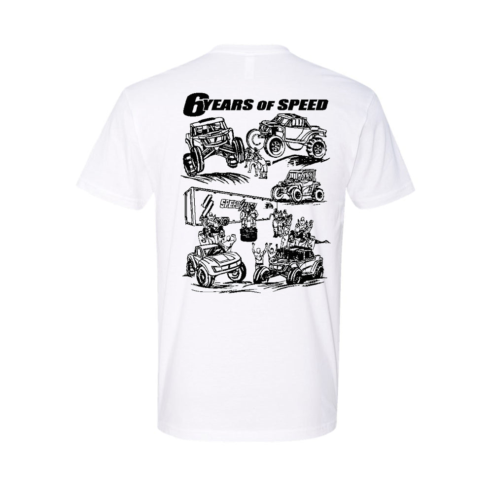 Celebrate six years of SPEED UTV in style with this limited-edition tee. Featuring a bold black “S” logo on the front chest and a “6 Years of Speed” cartoon graphic on the back, this shirt is the perfect mix of classic and eye-catching.